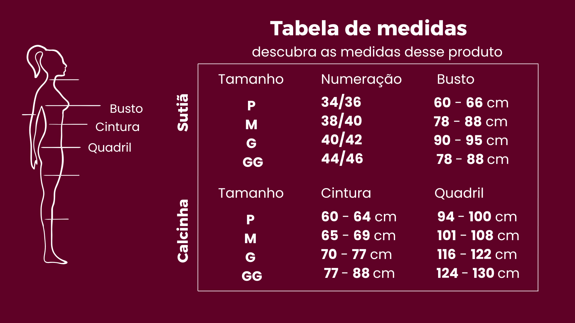 Medidas: 92 cm de busto | 69 cm de cintura | 105 cm de quadril/glúteo.